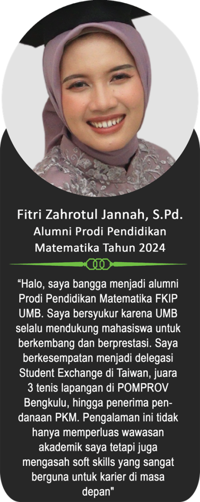 Sebagai bagian dari keluarga besar Universitas Muhammadiyah Bengkulu, para alumni telah menorehkan berbagai pencapaian membanggakan di berbagai bidang. Berikut ini adalah testimoni dari para alumni yang menggambarkan pengalaman mereka selama menempuh pendidikan di UM Bengkulu, serta bagaimana kampus ini telah membentuk mereka menjadi pribadi yang unggul, berintegritas, dan siap bersaing di dunia nyata.