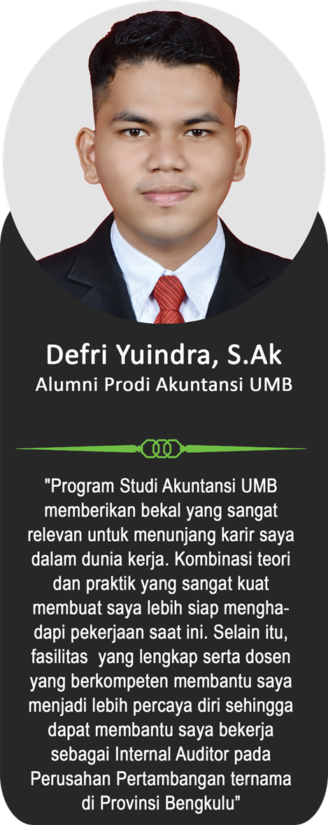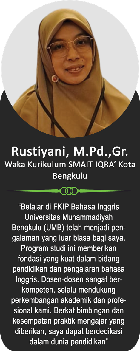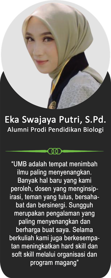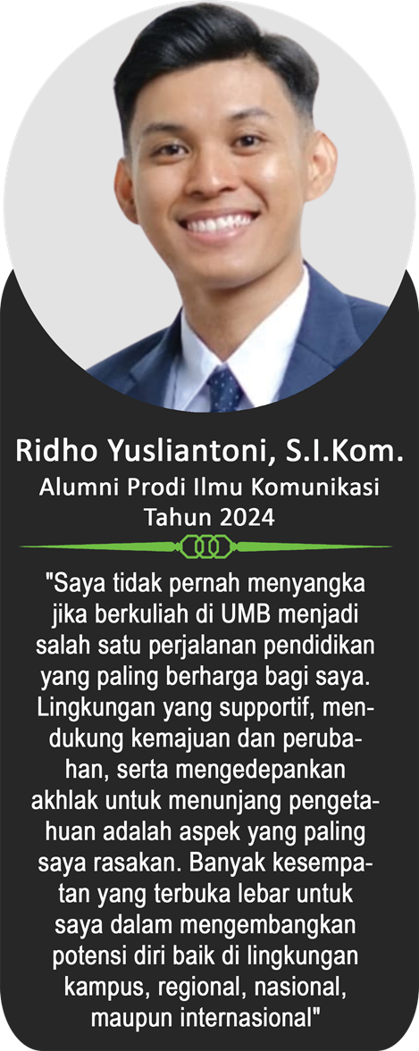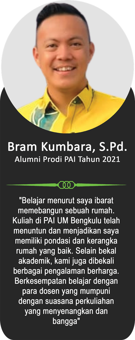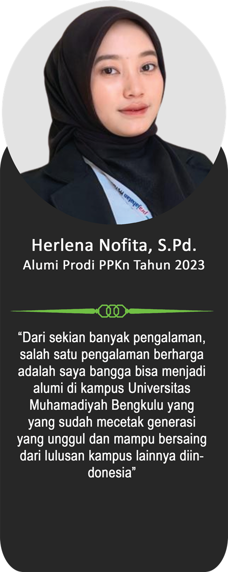 Sebagai bagian dari keluarga besar Universitas Muhammadiyah Bengkulu, para alumni telah menorehkan berbagai pencapaian membanggakan di berbagai bidang. Berikut ini adalah testimoni dari para alumni yang menggambarkan pengalaman mereka selama menempuh pendidikan di UM Bengkulu, serta bagaimana kampus ini telah membentuk mereka menjadi pribadi yang unggul, berintegritas, dan siap bersaing di dunia nyata.