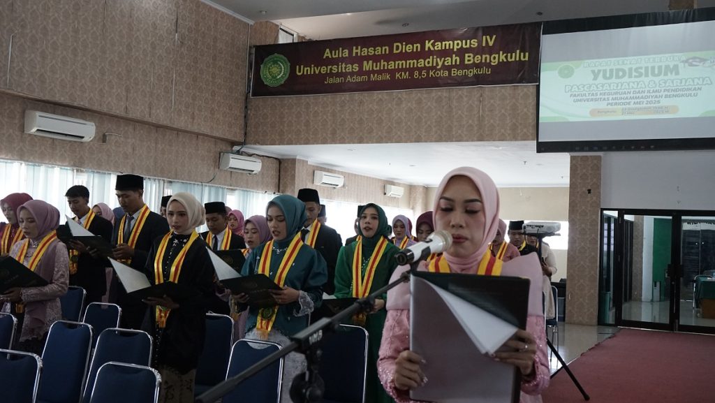 Yudisium sebagai ajang pengukuhan pencapaian gelar akademik bagi mahasiswa yang telah menyelesaikan masa studinya di jenjang pendidikan tertentu, tak terkecuali di level pendidikan program sarjana dan magister yang diselenggarakan oleh Fakultas Keguruan dan Ilmu Pendidikan (FKIP) Universitas Muhammadiyah Bengkulu. Momentum yudisium dilaksanakan di Aula Hasaan Diin kampus 4 UMB pada Hari rabu (21/05).