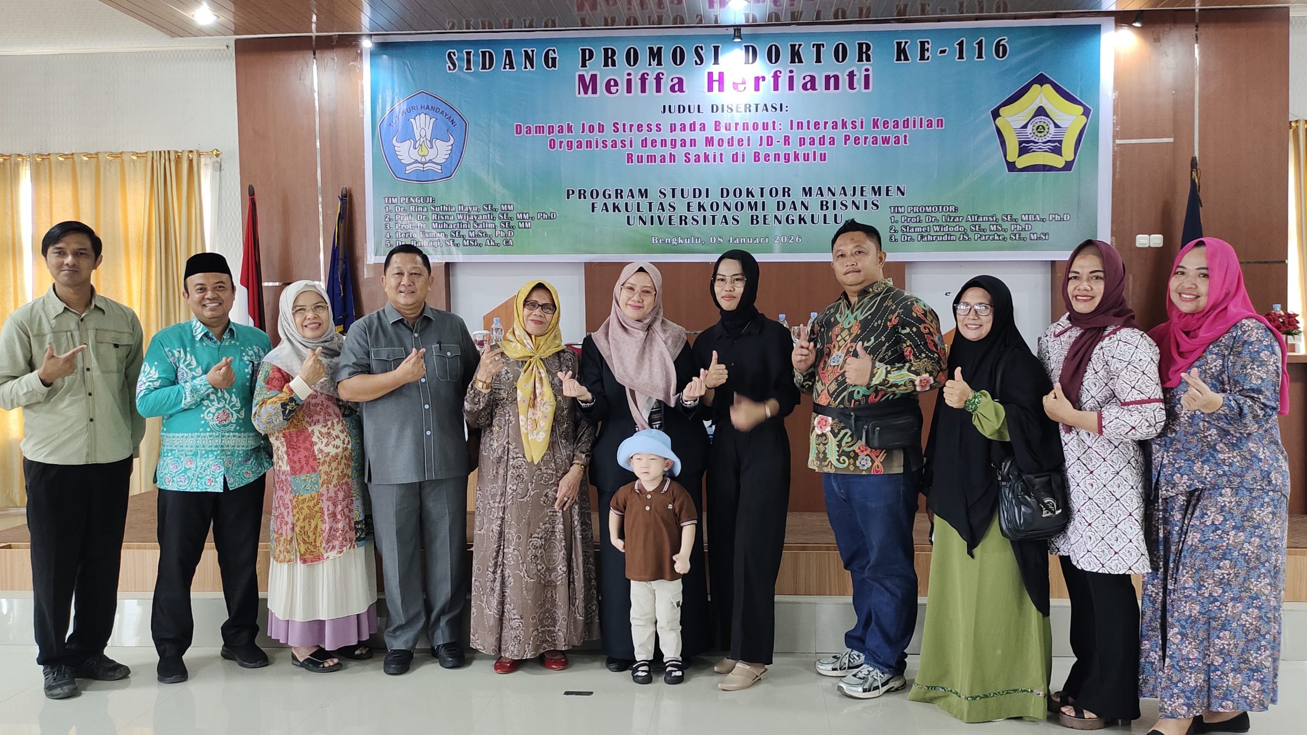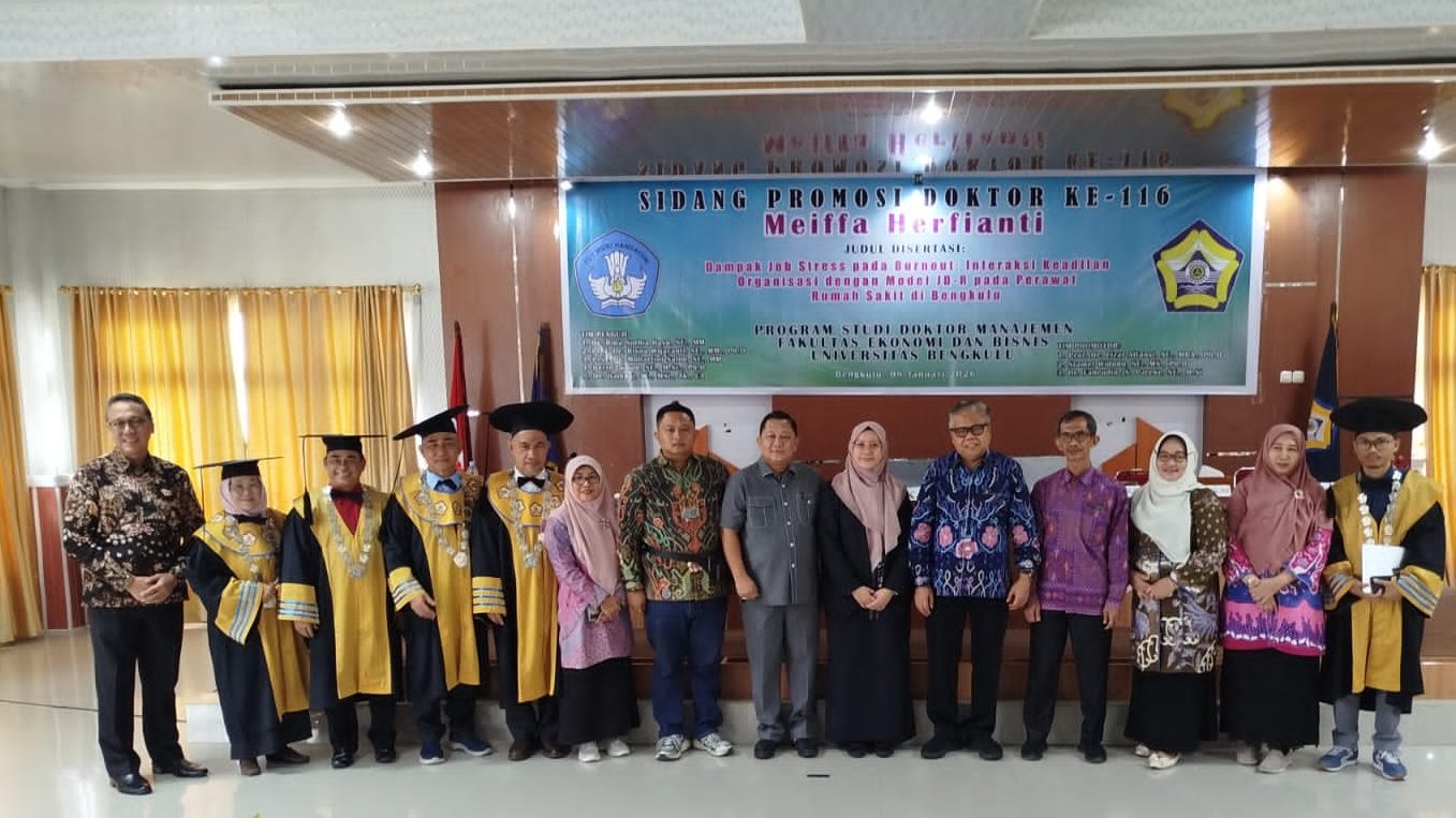 Pada kesempatan tersebut, Meiffa mempresentasikan disertasi berjudul “Dampak Job Stress pada Burnout: Interaksi Keadilan Organisasi dengan Model JD-R pada Perawat Rumah Sakit di Bengkulu.” Riset ini menyoroti isu penting di sektor kesehatan, khususnya bagaimana tekanan kerja dan kondisi organisasi memengaruhi kesejahteraan perawat serta kualitas layanan kesehatan.