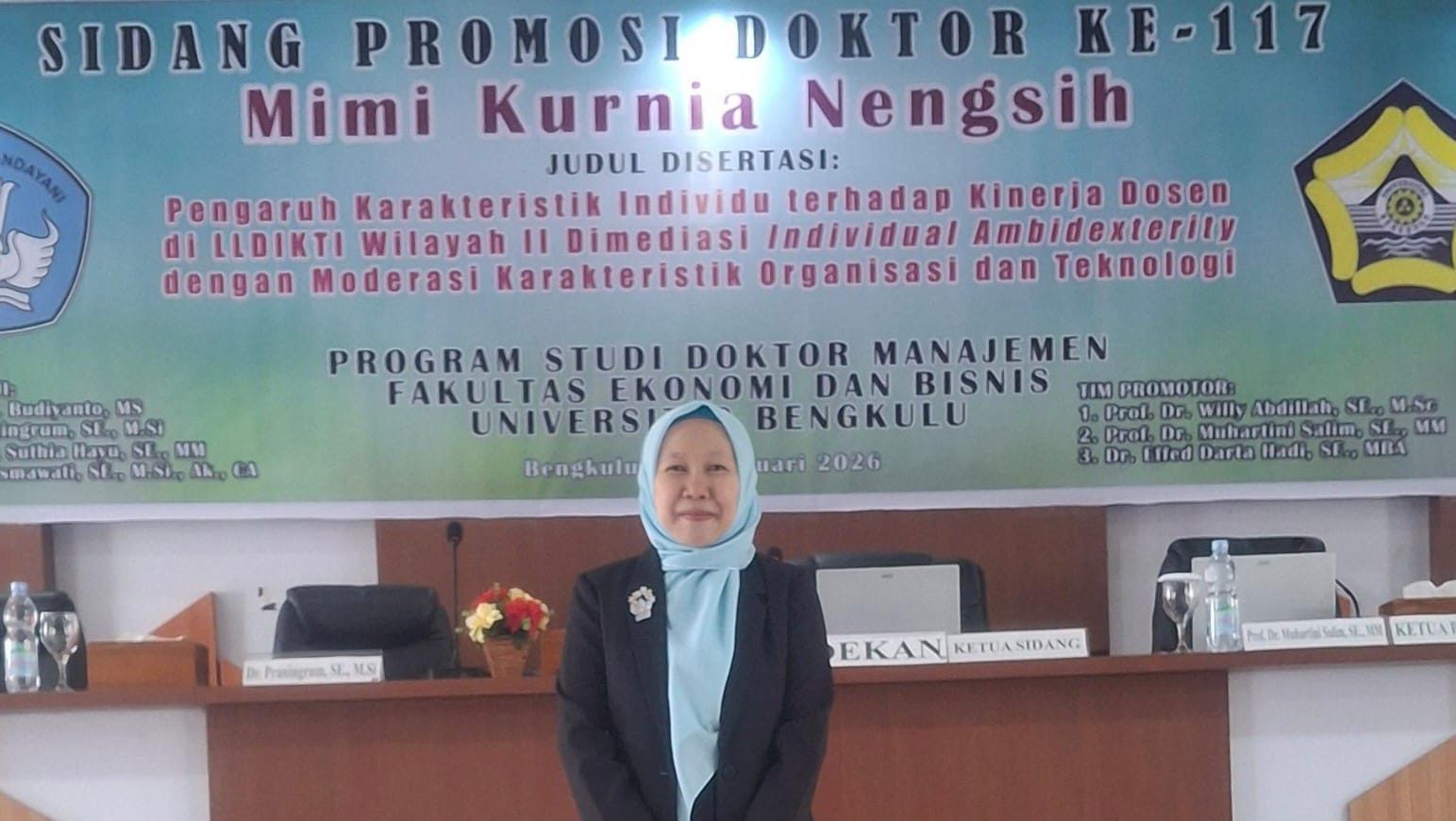 Dosen Program Studi Manajemen Fakultas Ekonomi dan Bisnis (FEB) Universitas Muhammadiyah Bengkulu (UMB), Mimi Kurnia Nengsih, S.E., M.M., melaksanakan Ujian Disertasi Terbuka Program Studi Doktor Manajemen Fakultas Ekonomi dan Bisnis Universitas Bengkulu pada Rabu, 4 Februari 2026, bertempat di Ruang Aula FEB Universitas Bengkulu. Sidang berlangsung mulai pukul 13.30 WIB hingga 15.30 WIB dengan melibatkan tim promotor dan dewan penguji dari kalangan akademisi Universitas Bengkulu.