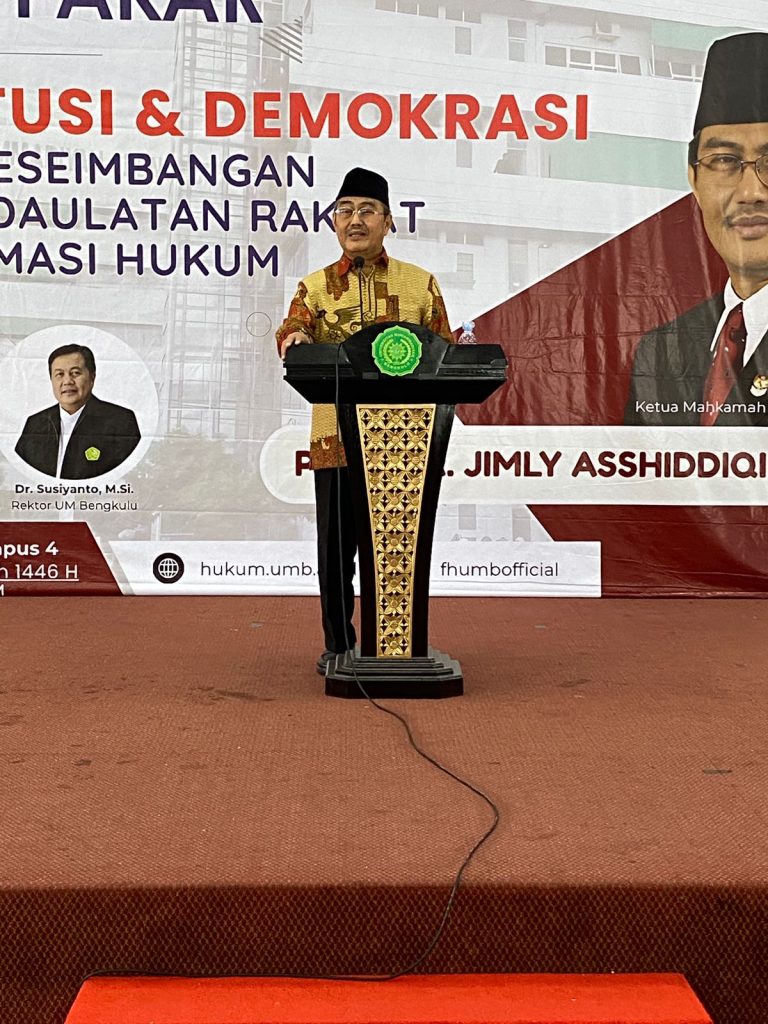Topik ini tegas Rangga menjadi sangat relevan di tengah dinamika demokrasi Indonesia pasca reformasi. Demokrasi kita terus tumbuh, namun tantangan untuk menjaga agar kedaulatan rakyat tidak melampaui batas hukum, dan agar hukum tidak menjadi alat kekuasaan, masih terus kita hadapi. Di sinilah pentingnya meneguhkan kembali posisi konstitusi sebagai fondasi utama yang mengatur hubungan kekuasaan dan menjamin hak warga negara. Dibagian akhir materi kuliahnya, Prof. Jimly berkomitmen untuk menyumbangkan Jimly Book Corner bagi Universitas Muhammadiyah Bengkulu yang disambut oleh tepuk tangan riuh mahasiswa. “Saya memiliki kurang lebih 77 judul buku, insyaAllah dengan sumbangan sponsor dari perbankan tadi paling tidak 70 judul buku insyaAllah siap saya sumbangkan untuk UMB”, ujar Prof Jimly. Tak lupa dia memotivasi mahasiswa UMB khususnya Hukum untuk terus berkiprah di kancah nasional, mesti ada gerakan atau pun sesuatu yang viral diskusi atau kritik dari mahasiswa UMB agar public Indonesia mengenal saudara, tegas Prof.