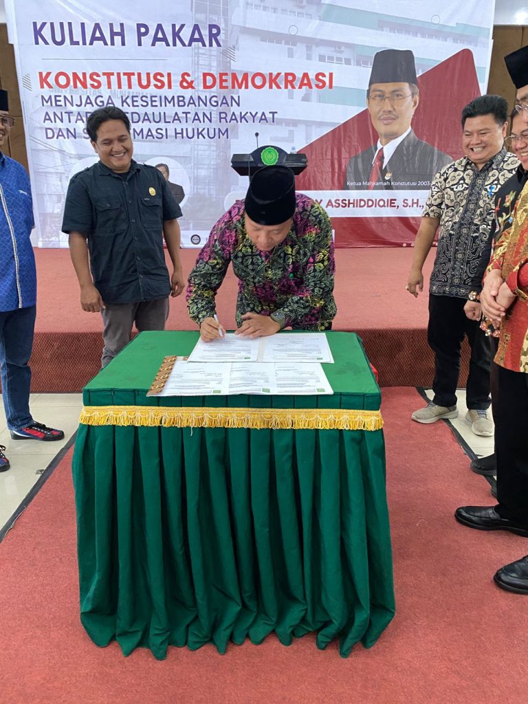 Ratusan mahasiswa program studi Ilmu Hukum, Sabtu (24/05) khitmat berkumpul di aula Hasan Diin kampus 4 Universitas Muhammadiyah Bengkulu, ratusan mahasiswa tersebut antuasias kuliah pakar dengan tema Konstitusi dan Demokrasi – Menjaga Keseimbangan antara Kedaulatan Rakyat dan Supremasi Hukum. Kuliah pakar kali ini sangat istimewa karena menghadirkan ketua Mahkamah Konstitusi periode 2003-2008, Prof. Dr. Jimly Asshiddiqie, S.H.,M.H. Dalam kesempatan yang sama dilakukan penandatangan MoU antara Kongres Advocat Indonesia (KAI) dengan Fakultas Hukum dan Fakultas Ilmu Sosial dan Politik Universitas Muhammadiyah Bengkulu,